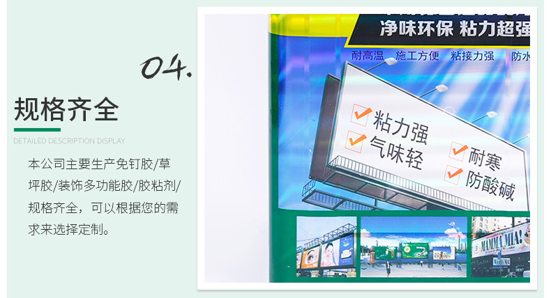 公司主要生产万能胶、草坪胶、免钉胶、结构胶、封边胶、玻璃胶、填缝剂等产品